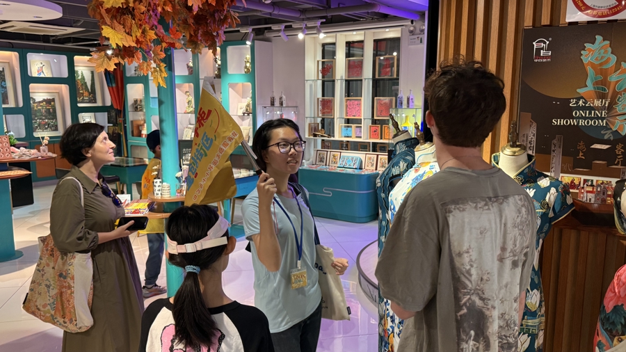 导览路线还串联了田子坊内多家创意店铺。小导游们介绍着原创设计师的服饰、充满海派元素的文创产品,不仅展现了田子坊作为“创意摇篮”的商业活力,更彰显了街区正积极打造的“儿童友好型”商业生态。在孩子们的带领下,外宾们感受到了一个超越购物体验的、充满人情味与发现乐趣的田子坊。